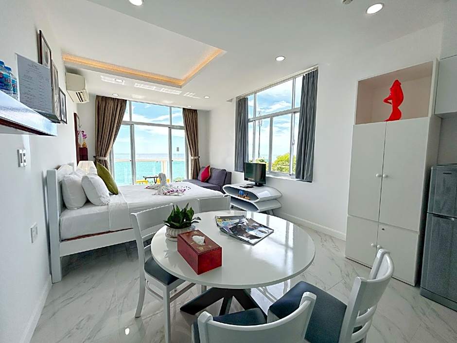 This apartment features a balcony with sea views, a seating area with a sofa and a flat-screen cable TV. A kitchen with a stove top and a dining area is also included.
